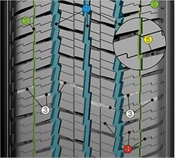 - тщательно продуманные по расположению поперечные канавки, обеспечивают достаточное сопротивление аквапланированию в условиях тающего снега и на склонах гор в течение всего срока службы протектора